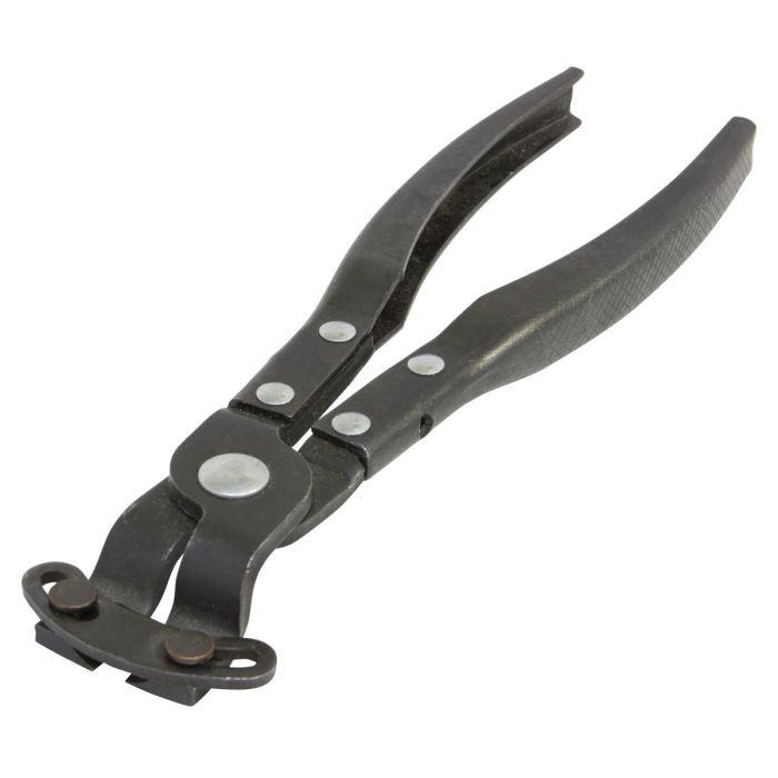 Crimps ear-type clamps in hard-to-reach areas. A special boot clamp crimping pliers that is designed to work in confined spaces. The pliers work from the side (head is turned 90 degrees) unlike traditional tools that work from the end. The unique offset design allows the technician to work on clamps on larger size boots. The top plate on the pliers flattens the crimp. These pliers work on most ear-type clamps exce-Point those requiring a torque reading.