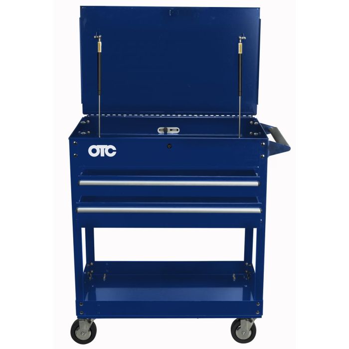 The OTC 1630 2-Drawer Service Cart allows you to take assorted tools or tool kits right to the vehicle for handy access. The cart features 5"over sized casters (2-locking; 2-non-locking), an ergonomic grip handle, screw driver storage, locking top and gas shocks to support the lid. The cart has a 500-pound load capacity and stands 39.5" tall, 33.25" wide and 20" deep. The bottom tray is perfect for bulkier storage items, like rags, cleaners and solvents. The top bin is 5" tall and houses the drawer locking mechanism. The first drawer is 3.25" tall and the second drawer is 4.25" tall, both with a generous 20" depth. Safely store diagnostic hardware, cameras and expensive tools securely and within arms reach. The 1630 2-Drawer Service Cart from OTC will help keep your work area organized and save you trips running back and forth to your main tool cabinet. Lifetime Warranty.