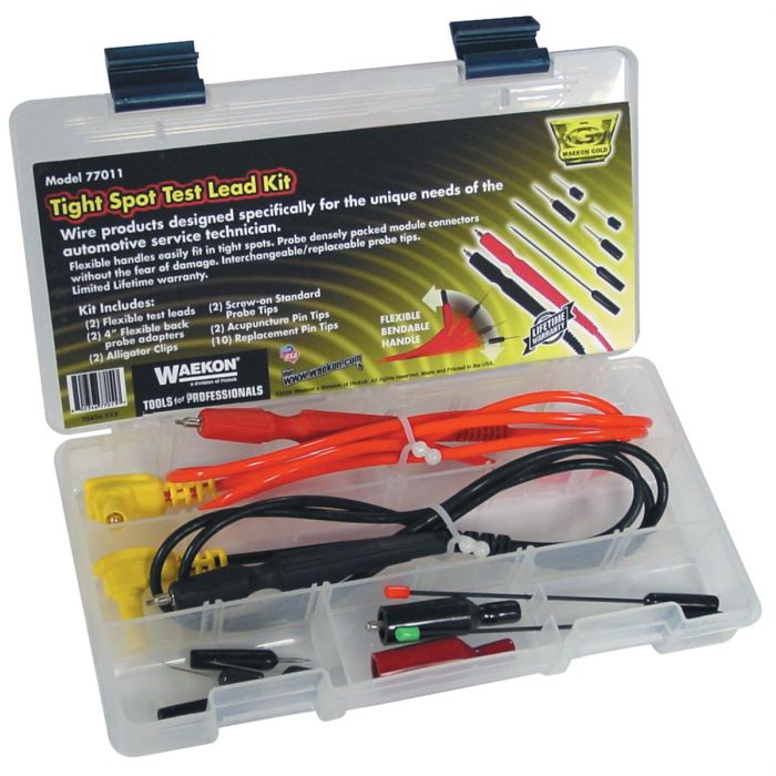 Wire products designed specifically for the unique needs of the automotive service technician. Provides tremendous versatility for any circuit testing situation with limited access. Alligator clips and back probe tips allow for fast easy hook up to wires, terminals and connectors. Heat and oil resistant coil cord and molded strain relief ends are designed to survive a lifetime in the harsh automotive environment. Kit includes: (2) flexible test leads, (2) 4” flexible back probe adapters, (2) alligator clips, (2) screw-on standard probe tips, (2) acupuncture pin tips and (10) replacement pin tips. Packaged in a plastic box.