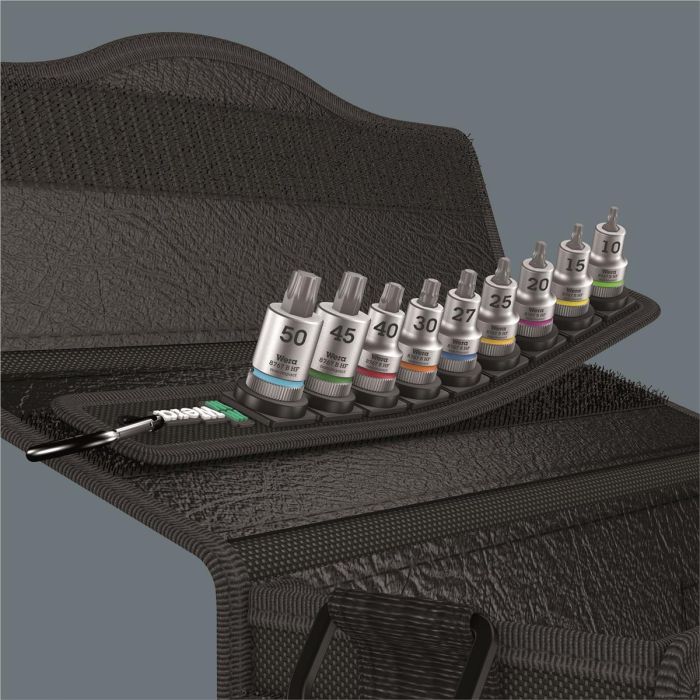 - 9-piece bit-socket set on a robust textile belt, ¼"