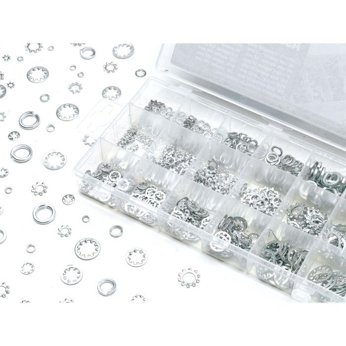 This 720 piece washer kit contains 12 popular sizes , which are (50) #6, (50)#8, (50) #10, (40) 1/4", (30) 5/16", (20) 3/8" Lock washers and (100) #6, (100) #8, (100) #10, (80) 1/4", (60) 5/16", (40) 3/8" Flat washers.